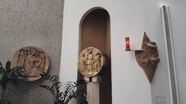 La vera sorpresa è alla fine, sacra, architettonica, giornalistica. La parte più bella di questo edificio, all'apparenza spoglio e semplice, è la facciata, concava e convessa, che cela alla vista l'ottagono formato dalle pareti, visibile dall'interno e da vedute aerofuturiste "a volo d'uccello". Accogliente e simbolica, richiama altre concavità/convessità strutturali e rimanda, insieme ad altri elementi sferici e circolari, al cuore pulsante di ogni chiesa: IL SANTISSIMO, custodito all'interno del Tabernacolo, sotto un archetto, quando non esposto per l'Adorazione nell'ostensorio sopra l'altare. Spesso ce ne dimentichiamo, ma DIO c'è. La sua presenza è indicata da una lampada o un cero sempre accesi. Il cemento a vista (béton brut) dà una connotazione "brutalista" (Brutalismo - Wikipedia) e maggior risalto alle vetrate colorate istoriate, al Crocifisso ligneo, a bassorilievi e altorilievi in terracotta. "In questo spazio", si legge sul sito (Parrocchia San Barnaba) , "potrete trovare informazioni utili sulla vita della parrocchia, come la preparazione e la celebrazione dei sacramenti dell'iniziazione cristiana e le varie iniziative legate all'oratorio e all'auditorium". Accento cromatico su cui converge lo sguardo dei fedeli, nel grigio-bianco predominante delle pareti, è il mosaico, posto come ali ai lati dell'altare, nella parte absidale. Sono sette gli elementi architettonici verticali, "menhir" preistorici rivisitati e corretti in chiave contemporanea, che formano una sorta di "cromlech", come quinte teatrali del nicchione di un ninfeo o del cortile del Belvedere in Vaticano. Rimandi...Pensate che la chiesa dedicata a San Barnaba (Barnaba (apostolo) - Wikipedia ) esiste pure a Milano ed è stata realizzata...rulli di tamburo...dall'architetto perugino Galeazzo Alessi. In essa si conserva anche un olio su tavola di Giovanni Paolo Lomazzo con San Francesco di Assisi che riceve le stimmate. "Alla fine del 2010", invece, "è stato completato, a cinquant'anni dal precedente, il restauro dell'intera facciata e della porta di ingresso al tempio, realizzata nel 1965 dallo scultore milanese Giovanni Maria Stoppani" (Chiesa di San Barnaba (Milano) - Wikipedia). Un trait d'union dunque tra le due città, in una sorta di gemellaggio "non ufficiale" e "non istituzionale" tra Umbria e Lombardia...già, Lombar..dia..